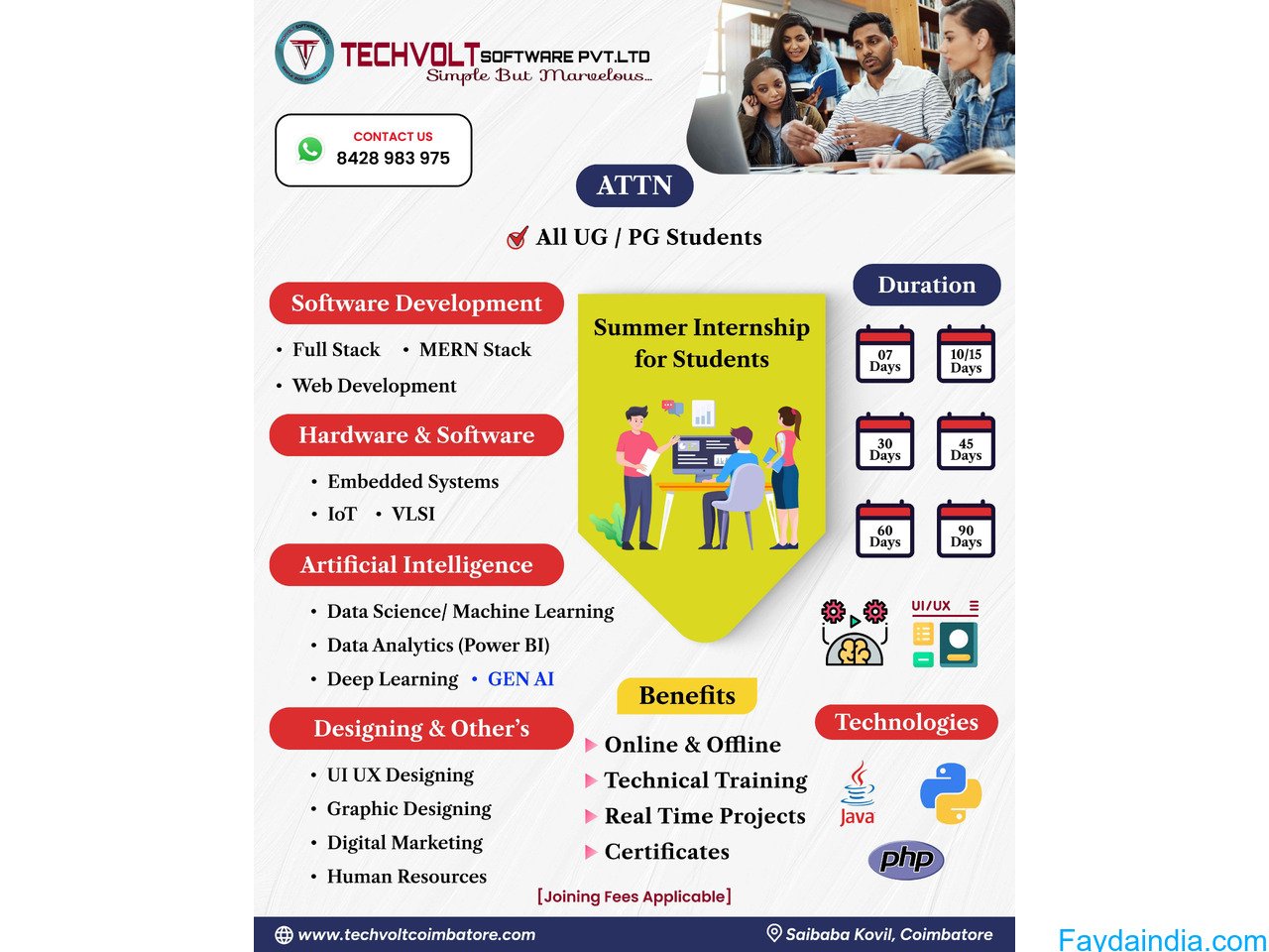 Techvolt Software offers summer internship for college students in Coimbatore in the field of Full Stack Development, Web Development, Mernstack Development, GEN AI Data Science, Machine Learning, Power Bi [Data Analytics], Deep Learning, Embedded Systems, Internet of Things, Graphic Designing, UI/UX Designing, Human Resource, Digital Marketing and Taxation. Student internships are available in both offline and online modes.